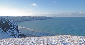 On the south of the Marloes Peninsula, the path follows the cliff behind Marloes Sands along to Gateholm - scene of a Time Team dig in 2011. Out to sea, the island of Skokhokm can be seen. It then skirts behind Albion Bay, named after the wreck there, parts of which can still be seen at very low tides, and along open cliff top, passing through the iron age hill fort (also investigated by the Time Team). The open grassy cliff top here has been the subject of experiments to return what was once arable farmland into heathland, by the application of raw sulphur. In some places this has resulted in rather bare patches, where nothing will grow at present, but in other areas heathland plants are returning and the short turf provides feeding areas for Chough and big flocks of larks, pipits and finches in the winter.